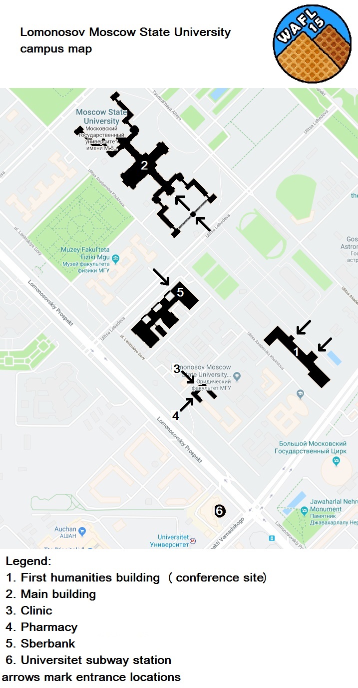 The MGU dorm is located in Section E of the main MGU building. To get there, please follow this map, which shows the direction from the Universitet (Университет) metro station (about 10 min. walk). If you take a taxi, ask the driver to drop you off at the Lebedeva St. (улица Лебедева ['ulʲicə 'lʲebʲidʲivə]) right in front of the main building. When you reach the security post shown on the map, you will be met by one of the organizers who will help you out with all the check-in formalities.
